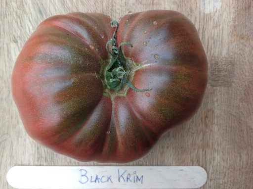 Black Krim, also known as 'Black Crimson', is a tomato variety that originated in Russia. The round, flattened and ribbed fruits ripen to a dark red colour with green to black shoulders over a period of approximately 70 to 80 days. This species can easily survive in colder areas.